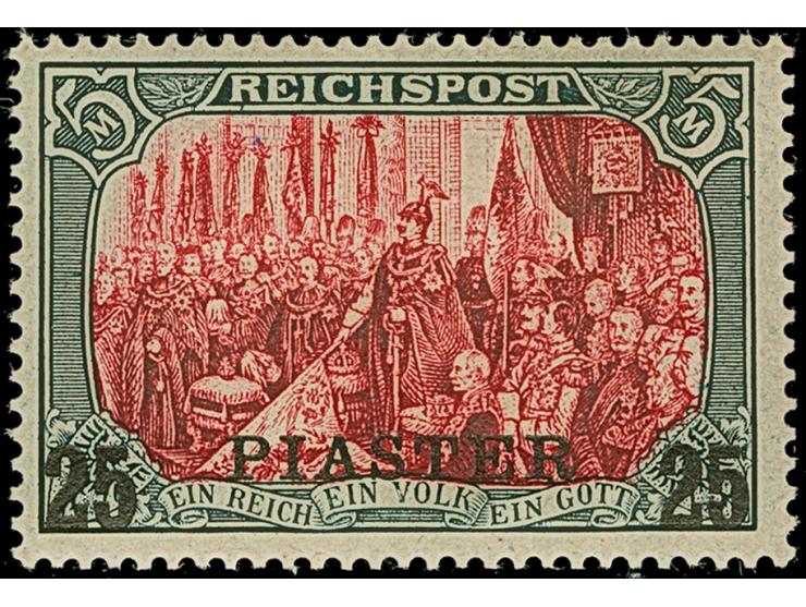 1900/04, Reichspost 25 PIASTER auf 5 M. in Type I ohne Nachmalung. Die farbfrische und sehr gut gezähnte Marke ist ungebraucht und in tadelloser Erhaltung, signiert Bothe BPP und Fotoattest Jäschke-L. BPP (2025)