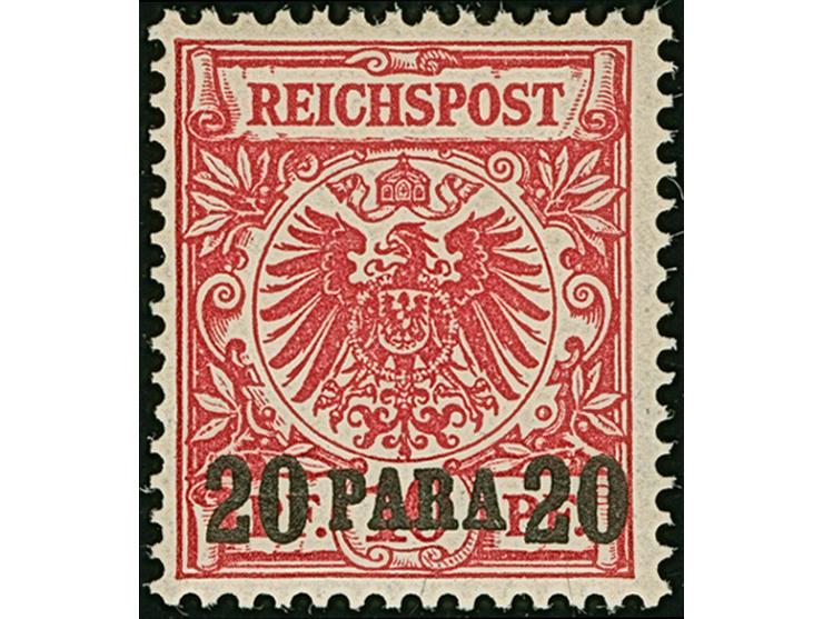 1889, 20 PARA auf 10 Pfg. dunkelrosa(rot) (gelblichorange quarzend), farbfrisch und sehr gut gezähnt, postfrisch und in tadelloser Erhaltung, unsigniert mit Fotoattest Jäschke-L. BPP (2025)