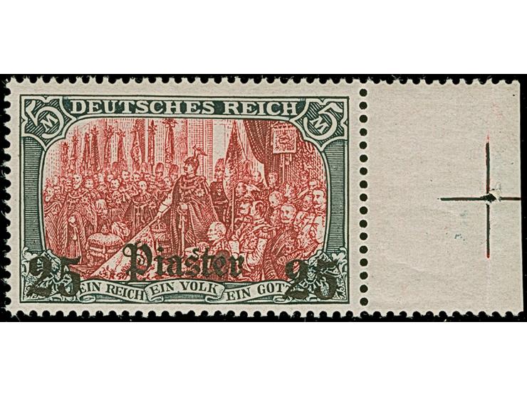 1905, 25 Piaster auf 5 M. grünschwarz/dunkelkarmin (Mittelstück gelblichrot quarzend), Randstück mit Passerkreuze. Die farbfrische und sehr gut gezähnte Marke ist postfrisch und in tadelloser Erhaltung (rechts vorgefaltet), unsigniert mit Fotoattest Jäschke-L. BPP (2025)
