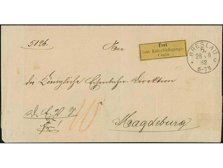 1874, Eisenbahn-Gebührenzettel der OPD Breslau “Frei laut Entschädigungs-Conto” schwarz auf gelb, oben lupenrandig, ansonsten vollrandig mit winzig übergehendem Stempel “BRESLAU 5 *c 28.8.82” auf Faltbriefhülle nach Magdeburg mit Ankunftsstempel. Die Briefhülle ist verklebt und hat unten einen längeren Einschnitt bzw. senkrechte Faltungen. Trotz der Einschränkungen ein optisch ansprechender Brief. Dieser Gebührenzettel ist auf Brief außerordentlich selten, Fotoattest Jäschke-L. BPP (2014)