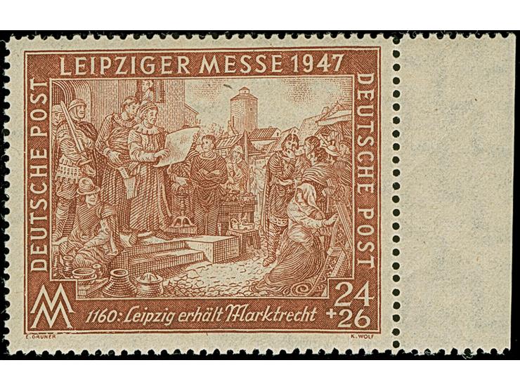 1947, Leipziger Frühjahrsmesse 24 Pfg. gezähnt L13 mit Wasserzeichen “Stufen steil steigend”, Randstück, postfrisch mit leichten Knitterspuren, ansonsten in einwandfreier Erhaltung, Fotobefund D. Schlegel BPP (2012) für ein angetrenntes Eckrandstück