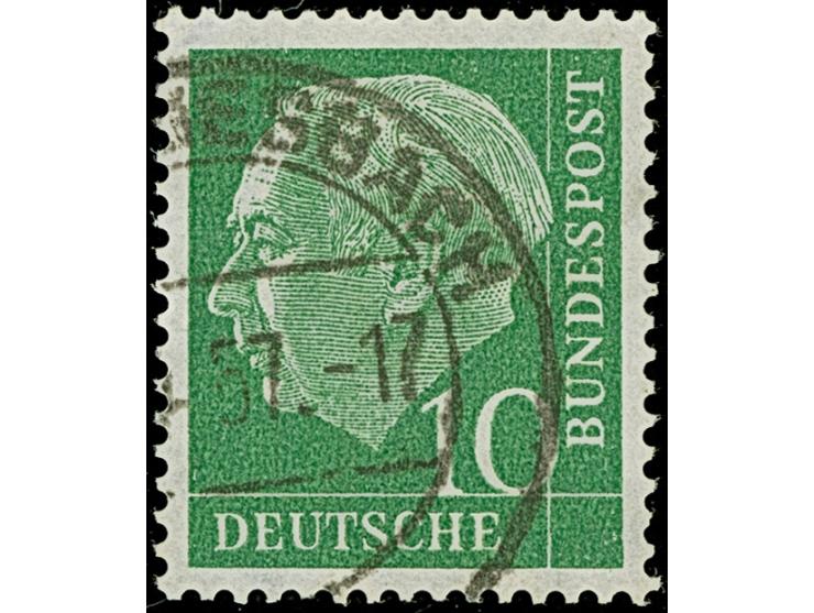1954, Heuss 10 Pfg. mit Wasserzeichen 4 Z, sauber gestempelt und normal gezähnt, in einwandfreier Erhaltung. Ein sehr schönes Exemplar dieser vermutlich seltensten Wasserzeichen-Abart der Heuss-Serie, bisher wurde nur eine weitere Marke in dieser Art bekannt, signiert A. Schlegel BPP und Fotoattest D. Schlegel BPP (2017)