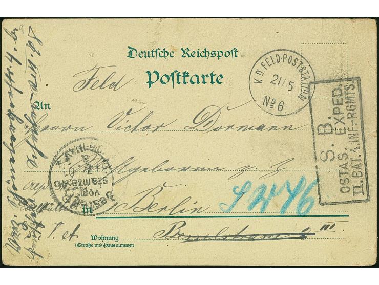 1901, Stempel “K.D.FELD.POSTSTATION No. 6 21.5.” klar auf Ansichtskarte “Aus Wesel” mit viel Text mit Vermerk “…jetzt aus China…” sowie Briefsttempel nach Berlin mit Ankunftstempel. Die Karte mit kleinen Beförderungsspuren im Rand, sonst in guter Erhaltung, doppelt signiert Bothe BPP mit Fotoattest (1975)
