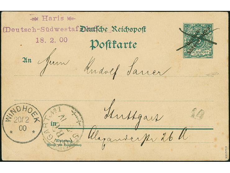 “Haris (Deutsch-Südwestafrika) 18.2.00” violetter L3 klar auf Ganzsachenkarte Ausgabe 1898 5 Pfg. mit Federstrich-Entwertung und viel Text via Windhoek nach Stuttgart mit vorderseitigem Ankunftsstempel. Die Karte mit kleinem Eckbug und zum Teil leicht fleckig, in guter Erhaltung. Eine seltene Verwendung des Stempel vom Ersttag aus dem Bedarf, signiert Mansfeld und Bothe BPP mit Fotoattest (1980)