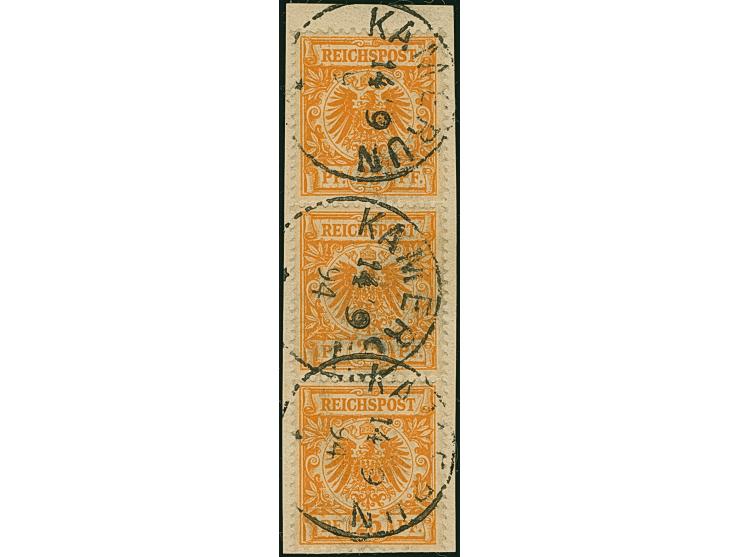 1890, Krone/Adler 25 Pfg. gelborange im senkrechten Dreierstreifen, jeweils einzeln mit Stempel “KAMERUN 14.9.94” entwertet auf Briefstück. Die obere Marke ist rechts leicht angetrennt und die untere Marke mit Scherenschnitt, in einwandfreier Erhaltung. Eine nicht häufige Einheit, signiert Bothe BPP mit Fotoattest (1976)