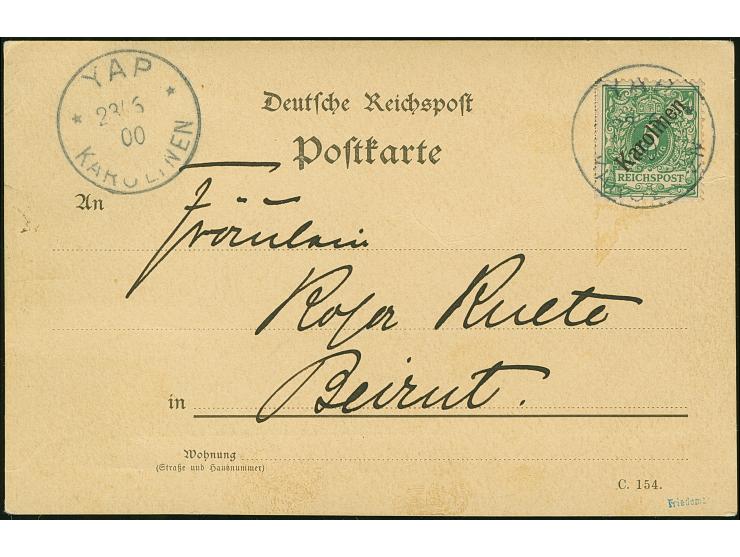 1899/1900, Diagonalaufdruck 5 Pfg. mit Stempel “YAP KAROLINEN 23.6.00” auf Postkarte mit rückseitig aufgeklebtem Foto vom Bezirksamtmann Arno Senfft mit Text nach Beirut, in einwandfreier Erhaltung. Eine nicht häufige Einzelfrankatur mit interessanter Verwendung als Fotokarte, signiert Friedemann und Fotoattest R. Steuer BPP (1994)