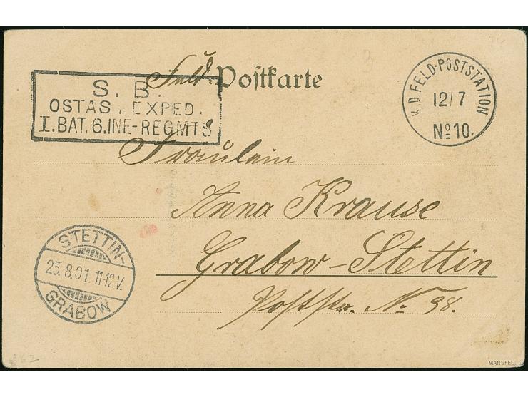 1901, “K.D.FELD.POSTSTATION No. 10 12.7” klar auf Feldpost-Ansichtskarte mit Text nach Stettin-Grabow mit vorderseitigem Ankunftstempel, kleine Randspuren, signiert Mansfeld