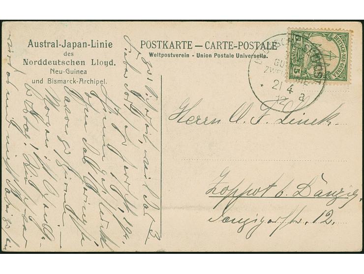 “DSP NEU-GUINEA ZWEIGLINIE *a 21.4.12” (Dampfer Coblenz) sehr klar auf Kaiseryacht 5 Pfg. auf Vordruck-Ansichtskarte “Chinesenviertel Kurapun Matupi” der Austral.-Japan-Linie" mit Text nach Zoppot, in guter Erhaltung