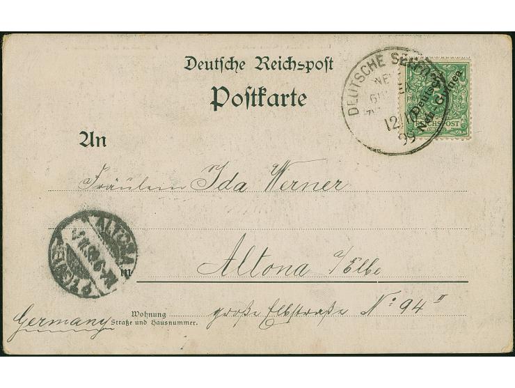 “DSP NEU-GUINEA-ZWEIGLINIE *b 12.10.99” (Dampfer Stettin) recht klar auf Ausgabe 1897 5 Pfg. auf Ansichtskarte “Gruss aus Matupi” mit viel Text nach Altona mit vorderseitigem Ankunftsstempel, in guter Erhaltung