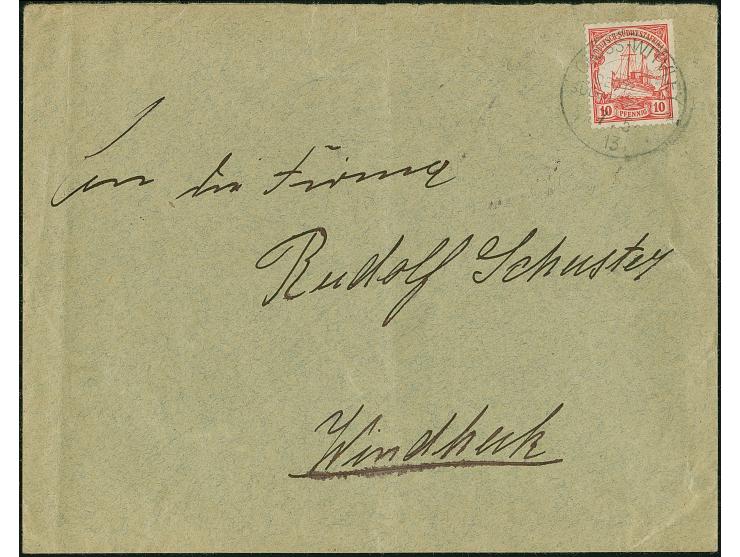“GROSS-WITVLEY DSWA 7.5.13” klar auf Kaiseryacht 10 Pfg. mit Wasserzeichen auf Umschlag nach Windhuk. Der Umschlag mit senkrechter Faltung und kleinen Randspuren, sonst in guter Erhaltung