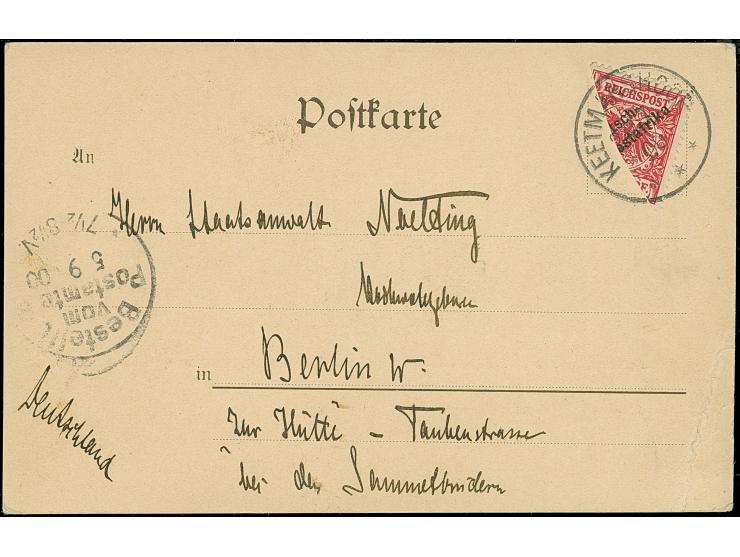 1900, 10 Pfg. diagonal halbiert (rechte Hälfte) mit Stempel “KEETMANSHOOP 24.7.00” auf Ansichtskarte mit Text nach Berlin mit vorderseitigen Ankunftsstempel. Die Karte rechts mit Randbug, die Marke ist in einwandfreier Erhaltung, doppelt signiert Bothe