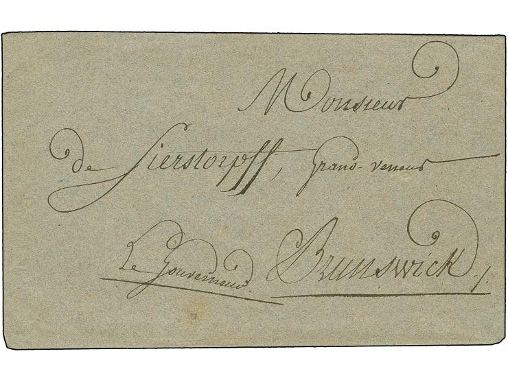 1807, kompletter Faltbrief mit dekorativem Briefkopf des Generalsquartiers und eigenhändiger Unterschrift des Militärgouverneurs Divisionsgeneral Baptiste Pierre Bisson , mit zugehörigem Briefkuvert an den Oberjägermeister Freiherr von Sierstorpff, ebenfalls in Braunschweig.