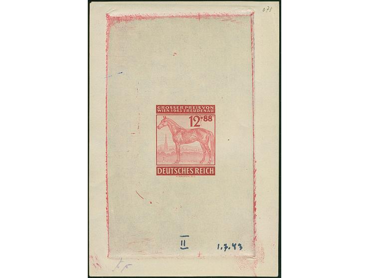 1943,  Großer Preis von Wien 12 Pfg. als ungezähnter Probedruck in Graukarmin als Einzelabzug im Blockformat (79 x 114 mm) mit Beschriftung “II 1.7.43”, postfrisch mit gummifreien Stellen und kleine Knitter durch die Schneidemaschine in den Ecken der Prägung, in einwandfreier Erhaltung. Einzelabzüge sind von dieser Ausgabe sehr selten, bisher sind nur wenige Exemplare bekannt, signiert Bühler und Ludin BPP mit Attest (1985)
