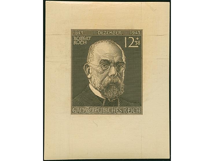 1944, Robert Koch 12 Pfg. als ungezähnter Probedruck in Grauschwarz ohne Stechernamen auf Barytpapier ohne Gummierung im Format 42 x 54 mm, von der Originalstichplatte stammend. Der außerordentlich seltene Probedruck ist in einwandfreier Erhaltung
