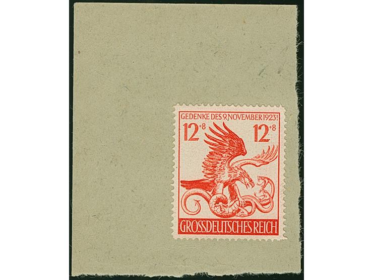 1944, 21. Jahrestag des Marsches zur Feldherrnhalle München 12 Pfg. als gezähnter Probedruck in Zinnober auf Vorlagekartonteil in einwandfreier Erhaltung. In dieser Art sehr selten, ProFi hat nur einen weiteren kompletten Vorlagekarton mit vier Marken registriert, signiert Ludin BPP mit Attest (1981)