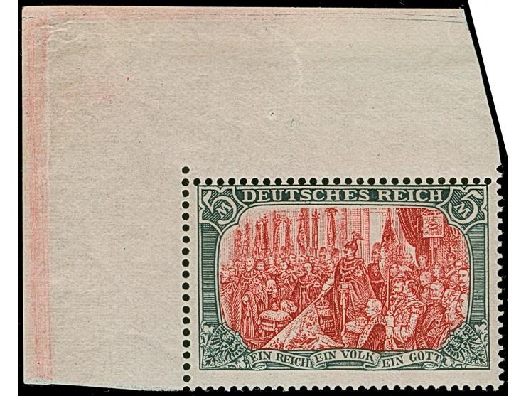 1905/12, 5 M. grünschwarz/dunkelkarmin (Mittelstück gelblichrot quarzend) aus der linken oberen Bogenecke, postfrisch und in tadelloser Erhaltung. Ein sehr schönes, farbfrisches und sehr gut gezähntes Exemplar, unsigniert mit Fotoattest Jäschke-L. BPP (2025)