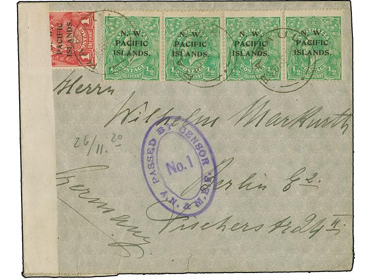 1918, ½ d. horizontal strip of four and 1 d., all tied by cds. “RABAUL 20 SE 20” to envelope to Berlin, censor tape and violet oval cachet, the envelope small tear at bottom, still fine