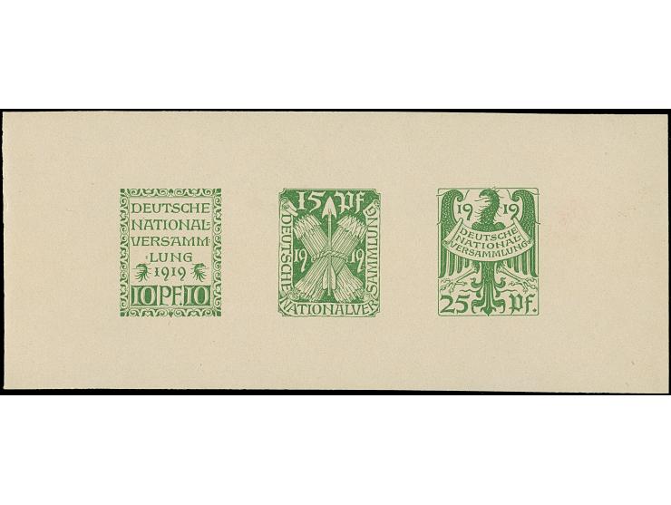 1919, Nationalsversammlung, Essais 10 Pfg.-25 Pfg., Einzelabzüge in Zusammendruck-3er-Streifen in grün (22x28mm) auf Kleinbogen (146x61mm), sehr gute Erhaltung, selten (Theuss Abb.15)