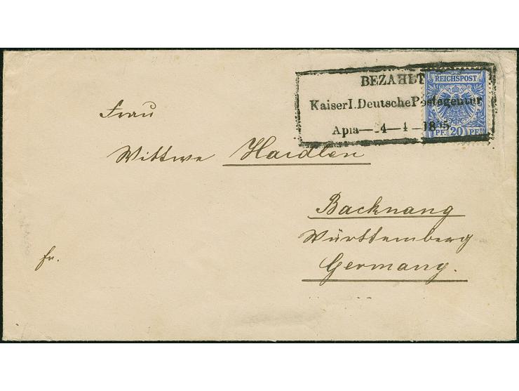 1890, Krone/Adler 20 Pfg. mittelultramarin mit Rahmenstempel “BEZAHLT Kaiserl. Deutsche Postagentur Apia-24-4-1895” auf Brief nach Backnang mit Ankunftsstempel. Der Umschlag mit Randspuren, die farbfrische Marke ist in einwandfreier Erhaltung, signiert Dr. Lantelme BPP
