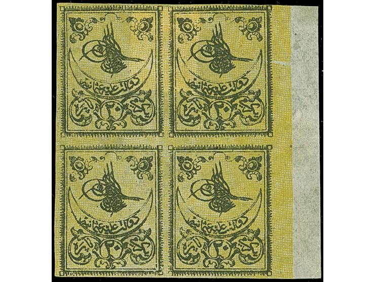 1862, Tughra 20 pa. yellow, trial printing for the third issue on thin gummed paper with ‘burele’ ground, right sheet marginal block of four (Type C-D/K-L). (The tabulation of the block reports and type are according to Tevfik Kuyas). Very Fine and an extremely rare multiple. (Isfila catalogue value for single stamps 13.300,-€, block of four is unpriced).