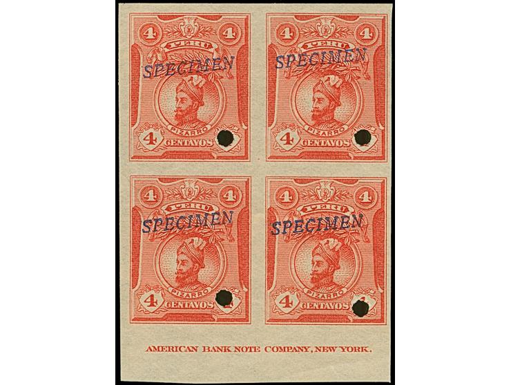 1909, Portrait Issue 1 c.-50 c. in imperforate blocks of four with lower sheet margin showing the American Ban Note Company imprint, each with security punch hole and overprint “SPECIMEN”, no gum, 12 c. light crease, otherwise fine
