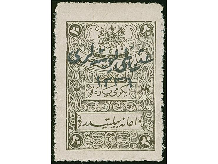 1920, Turkey in Asia: Theatre Tax Fiscal 20 pa. black, overprint in type II handstamped in black on thick white paper, unused with original gum, very well centered with excellent perforation for this issue. Certificate Yakup Nakri (2025): “Very rare example with albino overprint marks. A delightful example of an extraordinarily rare stamp” (Isfila catal. value 9.000€)