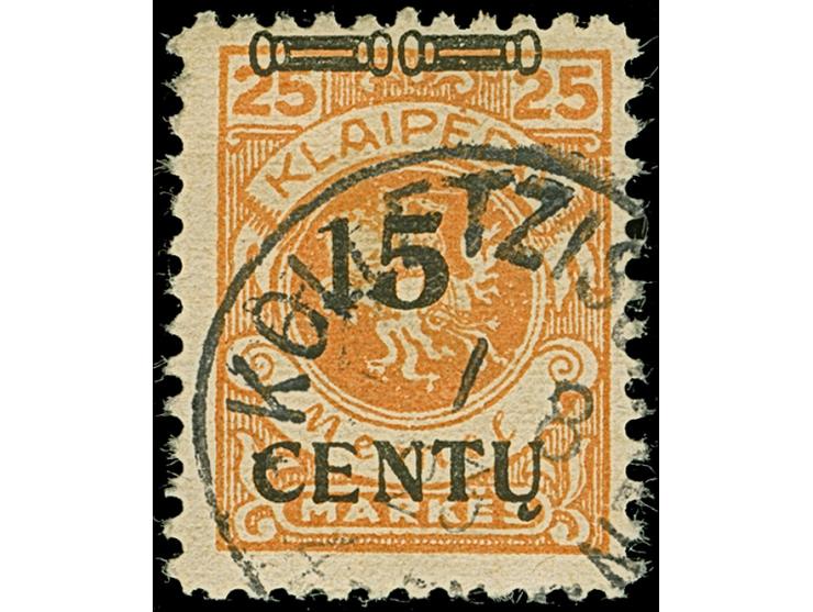 1923, 15 C. auf 25 M. lebhaftrötlichorange mit Aufdruckfehler “Wertziffer 5 von 15 dicker und mit kreisförmiger statt ovaler Rundung ” (Feld 49), sauber mit Stempel “KOLLETZIS(CHKEN) 1.8.23” entwertet und ausgabentypisch gezähnt, in einwandfreier Erhaltung. Ein sehr schönes Exemplar mit dieser äußerst seltenen Aufdrucktype, die nur in einer Teilauflage auf den Feldern 46-50 eingesetzt wurde. Bisher sind nur neun gestempelte Marken bekannt, Fotoattest Huylmans BPP (2025)