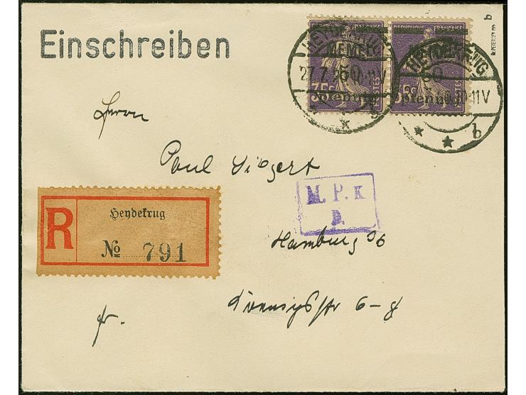 1920, 50 pf auf 35 C. (dunkel)rotviolett im waagerechten Paar mit Stempel “HEYDEKRUG **b 25.10.20” auf etwas überfrankiertem R-Brief mit Zensur-Ra2 “M.P.K.D.” nach Hamburg. Die linke Marke mit wenigen verkürzten Zähnen, ansonsten in einwandfreier Erhaltung. Bisher ist keine weitere Mehrfachfrankatur mit dieser seltenen Farbe bekannt, sign. Dr. Petersen BPP und Fotoattest Huylmans BPP (2025)