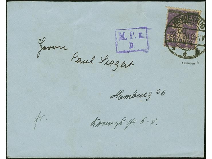 1920, 50 pf. auf 35 C. (dunkel)rotviolett mit Stempel “HEYDEKRUG 27.7.20” auf etwas überfrankiertem Brief mit Zensur-Ra2 “M.P.K.D.” nach Hamburg. Die Marke mit kleiner Zahnkerbe rechts oben, ansonsten wie der Brief in einwandfreier Erhaltung. Von dieser seltenen Farbe sind bisher nur drei Einzelfrankaturen aus gleicher Korrespondenz bekannt, sign. Dr. Petersen BPP und Fotoattest Huylmans BPP (2025)