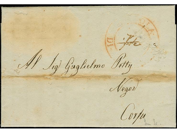 1818, entire letter endorsed inside “Zante 7 Augusto” to Corfu, faint red circular “IS(OLA) DI (ZANTE)” and framed “FRANCA”, fine, together with a 1819 entire letter from Malta to Corfu, endorsed “P. Osprey” and with faint red circular “ISOLA IONIE” with manuscript "45." gazette to pay, fine, both entires slitted and treated against cholera. A rare and early duo from the British Protectorate period