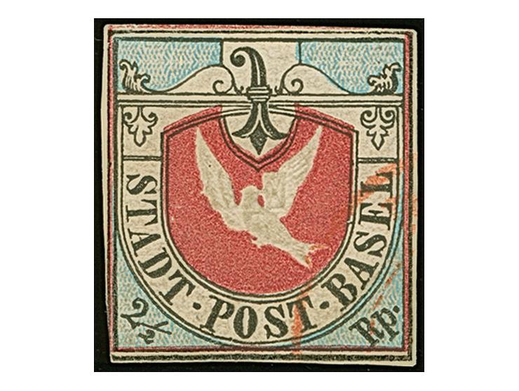 1845, Basler Taube 2½ Rp. schwarz/karmin/lebhaftblau, sehr schön farbfrisch, links unten in der äußeren Randlinie berührt, sonst allseits vollrandig, leicht entwertet durch roten DKr. Rückseitig leichte Aufrauhungen und die rechte untere Ecke hinterlegt, sonst einwandfrei. Ein schönes Stück der seltenen Marke. Fotoattest Hunziker (1966)