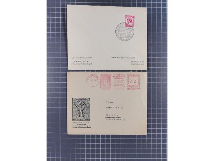 1935, Ostropa Briefmarken-Ausstellung, kleine Partie mit 11 Briefen und Karten, dabei u.a. Mi.Nr. Bl. 3 mit Zufrankatur auf eingeschriebenem Brief mit Sonderstempel nach Regensburg mit rückseitigem Ankunftsstempel (kleiner Papiermangel links), Brief mit Messe-Werbestempel Firma Paul Koch (klein Bug), etc., meist in schöner Gesamterhaltung