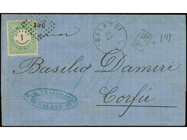 1875, unpaid letter sheet from "GALATZI 20 APR" via Vienna and Triest to Corfu, taxed "100" lepta and paid with postage due 1875, 1 dr., tied by dotted "106". The stamp stamp was lifted for inspection, otherwise very fine and fresh. A very rare and attractive pre-UPU cover. Certificate Simmermacher BPP (2004)
