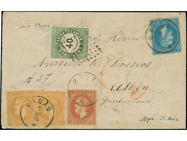 1872, Paris print 10 b. blue, 15 b. deep brown and 25 b. yellowish bistre (2), tied to envelope from "BACAU 7 JUN 75", endorsed "via Varna", to Athens, paying the full tariff for mail to Greece of 75 bani (the cover was presumably held at the P.O. awaiting full payment, as the 10 b. is cancelled a day after the other three stamps). On reverse transit marks of Bucharest, Galatz, Constantinople and Piraeus. Charged for local delivery with postage due 1875, 40 l. tied by dotted "1". An exceptional and most unusual pre-UPU cover. Certificate Heimbüchler (2012).