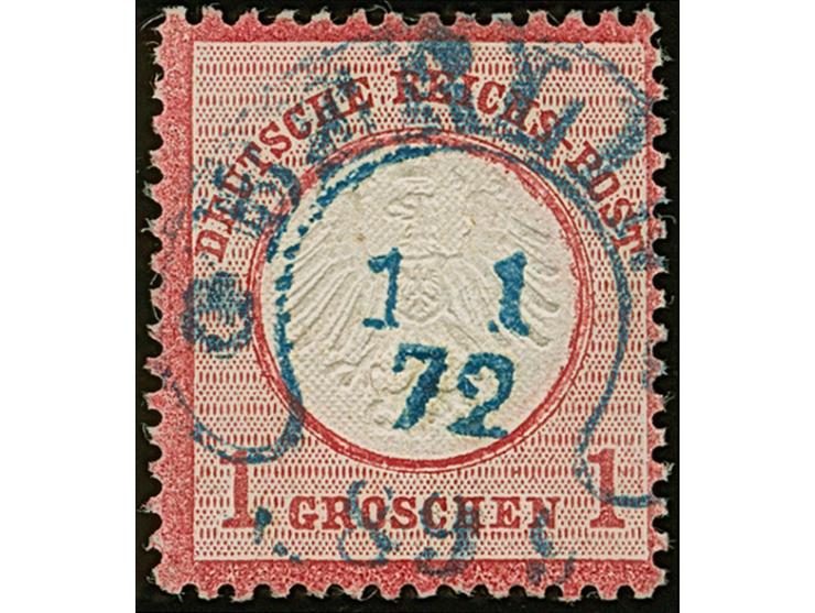 “BERLIN** 1.1.72” (Spalink 1-N3b) in Blau klar auf loser Marke kleiner Schild 1 Gr. karmin. Die farbfrische Marke ist gut geprägt und gut gezähnt, in einwandfreier Erhaltung. Eine auf dieser Marke äußerst seltene Entwertung vom Ersttag (wieder verschiedene Lettern bei der “1”) der Brustschildmarken, Fotoattest Sommer BPP (1995)