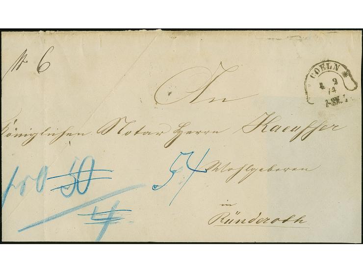 “COELN 4.2.74” (Spalink 4-13y1) klar auf langformatigem Postvorschuss-Briefvorderseite für die Einziehung von 1 Thaler mit Auslagen-Stempel nach Rüderoth. Der geänderte Tax-Vermerk beinhaltet die Postgebühr in Höhe von 4 Groschen und 50 Groschen für die Einziehung des Geldes, beides wurde vom Empfänger eingezogen. Die Vorderseite mit senkrechter Faltung und leichten Randspuren ist in guter Gesamterhaltung. Ein auf Brief seltener Stempel mit Fotoattest Krug BPP (2013)