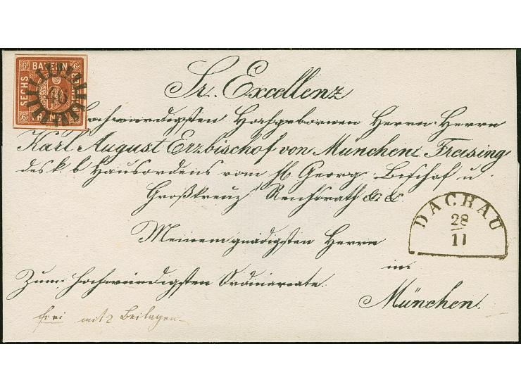 6 Kr. rötlichbraun, voll- bis breitrandig, mit klar und zentrisch aufgesetztem gMR "46" und klar nebengesetztem Halbkreis "DACHAU 28/11" auf Bischofsbrief an Karl August in München. Tadellos. Signiert Schmitt BPP
