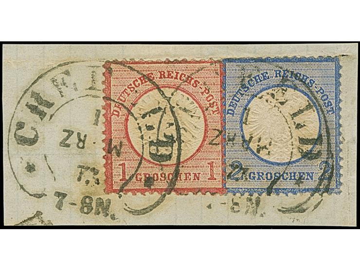 “CREFELD 1 MÄRZ.73” (Spalink 6-4) zweimal klar mit kopfstehender Monats-Angabe auf großer Schild 1 und 2 Gr. auf Briefstück. Beide farbfrischen Marken sind gut geprägt und haben Zahnverkürzungen oben, ansonsten in guter Erhaltung