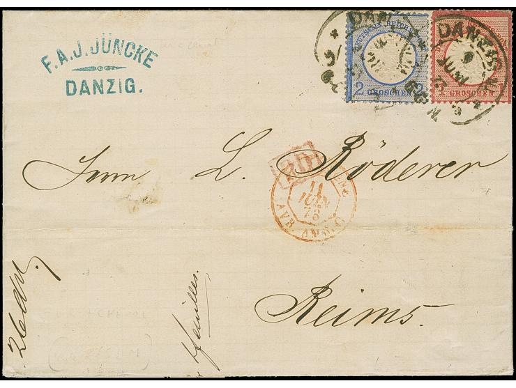 “DANZIG NI 9.JUNI.73” (Spalink 7-1) zweimal recht klar auf großer Schild 1 Gr. und 2 Gr. im kleineren Format L15 als tarifgerechte Frankatur auf komplettem Faltbrief  mit frz. Transitstempel nach Reims mit Ankunftsstempel. Die farbfrischen Marken sind gut geprägt, normal gezähnt mit verkürzten Zähnen durch Randklebung und wie der Faltbrief in guter Erhaltung, Fotobefund Sommer BPP (2004)