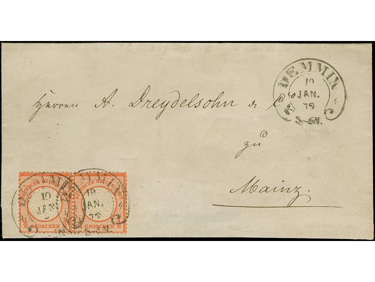 “DEMMIN 19.JAN.72” (Spalink 8) mehrfach klar auf waagerechtem Paar kleiner Schild ½ Gr. ziegelrot als tarifgerechte Mehrfachfrankatur auf Faltbriefhülle nach Mainz mit Ausgabestempel. Die farbfrischen Marken sind gut geprägt, gut gezähnt und bis auf eine kleine Druckstelle bei der linken Marke in einwandfreier Erhaltung, Fotobefund Sommer BPP (2005)