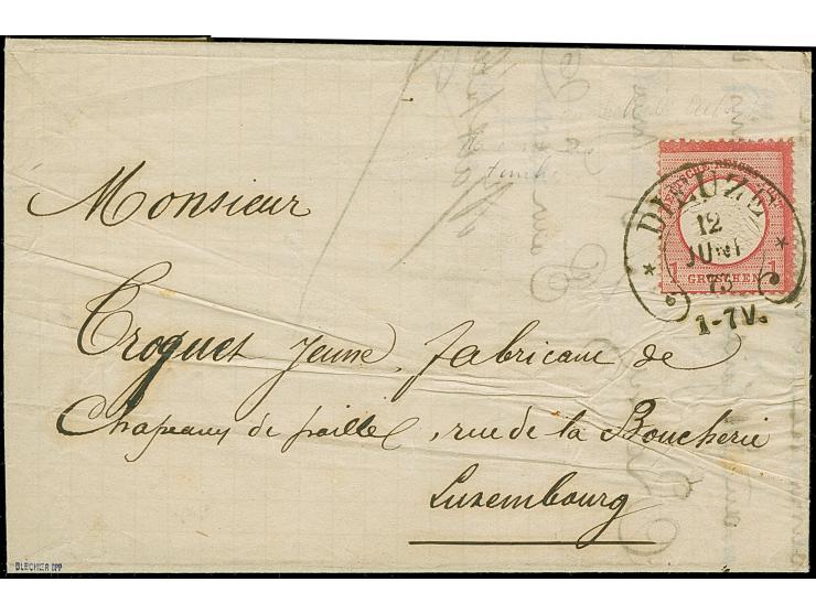 “DIEUZE 12.JUNI.73” (Spalink 9) sehr klar auf großer Schild als tarifgerechte Einzelfrankatur auf komplettem Faltbrief im Wechselverkehr nach Luxemburg mit Ankunftsstempel. Der Faltbrief mit Knitter- und Faltspuren, die farbfrische Marke ist deutlich geprägt, normal gezähnt und in einwandfreier Erhaltung, signiert Blecher BPP