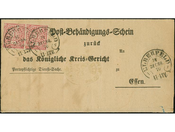 “ELBERFELD 14.DECEBR.70” (Spalink 12-1) mehrfach klar auf waagerechtem Paar Norddeutscher Postbezirk 1 Gr. gezähnt als tarifgerechte Mehrfachfrankatur auf komplettem Postbehändigungsschein nach Essen mit Ankunftsstempel. Der Faltbrief mit Falt- und Randspuren, die farbfrischen Marken sind in einwandfreier Erhaltung, Fotobefund Mehlmann BPP (2019)