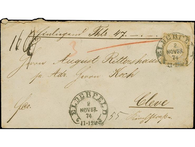 “ELBERFELD 2.NOVBR.74” (Spalink 12-5) klar auf großer Schild 5 Gr. ockerbraun als tarifgerechte Einzelfrankatur auf Wertbrief nach Cleve mit Ankunftsstempel. Die Marke ist deutlich geprägt und repariert, ansonsten in guter Erhaltung. Eine nicht häufige Verwendung dieser Stempeltype als Reservestempel, Fotobefund Krug BPP (2019)