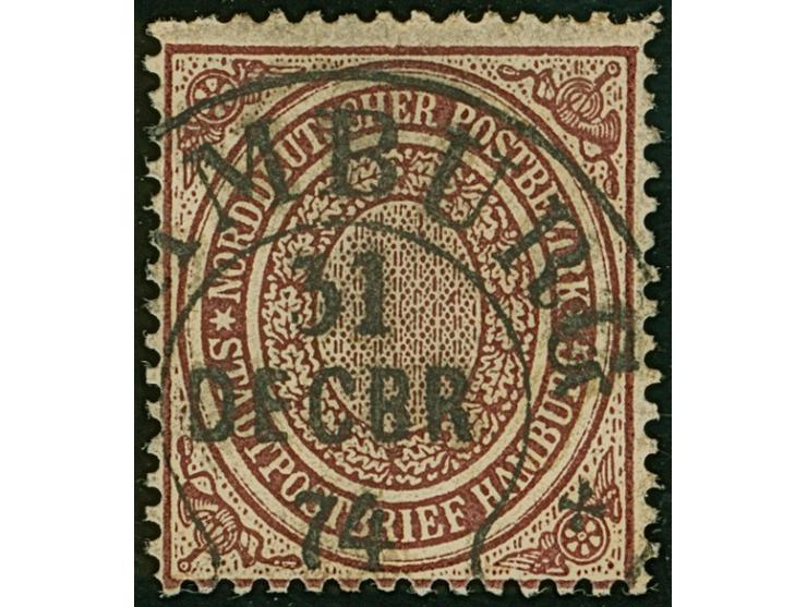 “HAMBURG** 31.DECBR.74” (Spalink 17-10) klar auf loser Marke Norddeutscher Postbezirk Stadtpostmarke (½ Sch.) gezähnt. Die farbfrische Marke hat oben verkürzte Zähne und eine kleine helle Stelle, ansonsten in einwandfreier Erhaltung. Eine seltene Verwendung vom Letzttag der Postgültigkeit, ProFi hat nur eine weitere lose Marke registriert, Fotobefund Mehlmann BPP (2014)