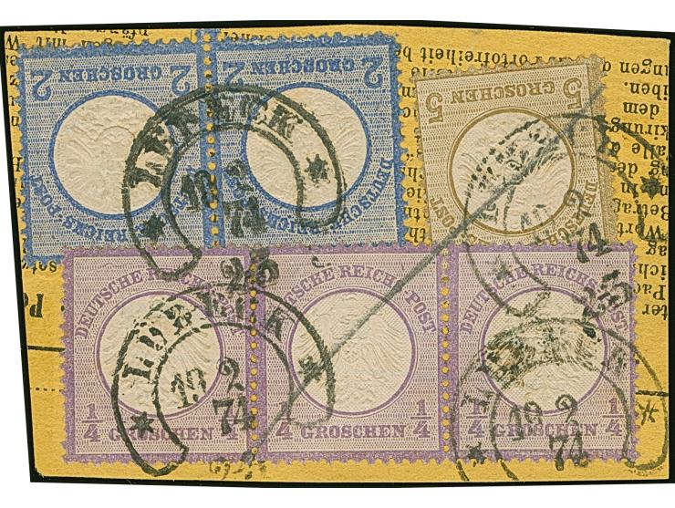 “LÜBECK** 19.2.74” (Spalink 22-1) mehrfach klar auf kleiner Schild ¼ Gr. graupurpur im waagerechten Dreierstreifen und Einzelwert 5 Gr. ockerbraun in Mischfrankatur mit waagerechtem Paar großer Schild 2 Gr. grauultramarin auf Paketkarten-Briefstück. Die farbfrischen Marken sind gut geprägt und üblich bis gut gezähnt. Die linke ¼ Gr.-Marke mit verklebtem Einriss und eine 2 Gr.-Marke mit Eckzahnbug, ansonsten in einwandfreier Erhaltung. Eine dekorative Buntfrankatur mit besserem Hufeisenstempel, Fotobefund Sommer BPP (2006)