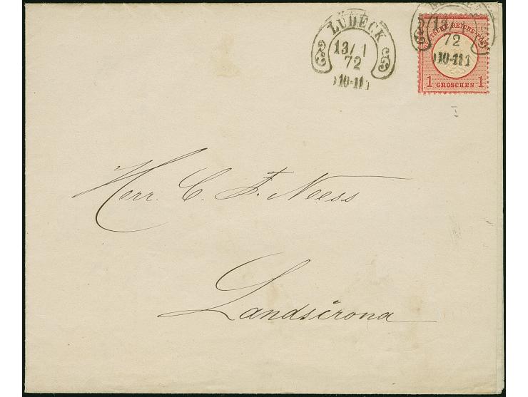 “LÜBECK 13.1.72” (Spalink 22-2) klar auf kleiner Schild 1 Gr. karmin als tarifgerechte Einzelfrankatur auf Drucksachen-Faltbrief ohne Inhalt nach Landskrona, Schweden mit Ankunftsstempel. Bis zur Ermäßigung der Gebühr vom 1.10.1873 betrug die Gebühr für eine Drucksache bis 40 g 1 Groschen. Die farbfrische Marke ist gut geprägt, gut gezähnt und wie der Faltbrief in einwandfreier Erhaltung. Eine nicht häufige und frühe Verwendung aus dem Ausgabe-Monat, Fotobefund Sommer BPP (2001)