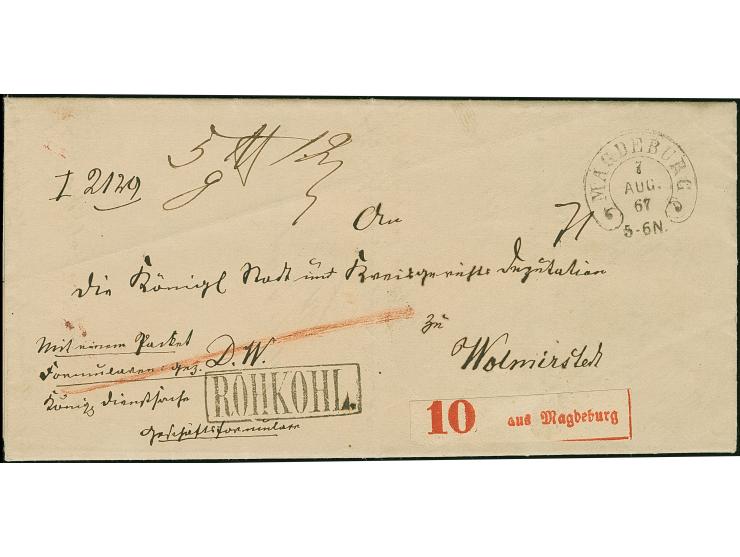 “MAGDEBURG 7.AUG.67” (Spalink 23) klar auf portofreiem, kompletten Paketbegleit-Faltbrief mit Beamtenstempel “Rohkohl” nach Wolmirstedt mit Ausgabestempel. Der Faltbrief mit leichtem diagonalem Bug, ansonsten in guter Erhaltung. Ein dekorativer Brief mit dem besseren Hufeisenstempel, Fotoattest Wasels BPP (2019)