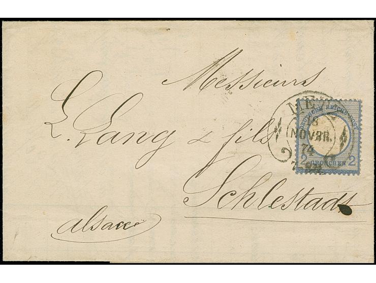 “METZ 18.NOVBR.74” (Spalink 25-2) klar auf großer Schild 2 Gr. grauultramarin auf komplettem Faltbrief nach Schlettstatt mit rückseitigem Hufeisenstempel “SCHLETTSTADT19.NOVBR.74” (Spalink 33) als Ankunftsstempel. Die farbfrische Marke ist gut geprägt, gut gezähnt und wie der Faltbrief in einwandfreier Erhaltung. Ein interessanter Brief mit besserem Hufeisenstempel und sogenanntem “Doppelspänner”, signiert Sommer BPP mit Fotobefund (2006)