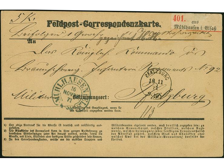 “MÜHLHAUSEN i. ELS 16.NOVBR.71” (Spalink 26-1) sehr klar auf amtlicher Feldpost-Correspondenzkarte als portofreie Militaria-Paketbegleitkarte nach Ratzeburg mit vorderseitigem Ankunftsstempel, in guter Erhaltung. Eine ganz ungewöhnliche Verwendung bei der Fahrtpost