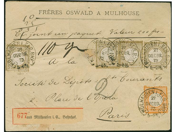 “MÜLHAUSEN i. ELS. BHF. 27.DECBR.73” (Spalink 26-6) mehrfach klar auf vier Einzelmarken großer Schild 5 Gr. ockerbraun und Einzelwert ½ Gr. orange auf dreiseitig geöffnetem Wert-Paketbegleit-Briefkuvert mit Wertangabe 200 Franken nach Paris mit rückseitig zwei französischen Fiskalmarken 10 und 25 Centimes. Die farbfrischen Marken sind sehr gut geprägt, die ½ Gr.-Marke ist eckrund und die linke 5 Gr.-Marke hat zwei Nadellöcher, ansonsten sind die Marken in einwandfreier Erhaltung. Der Umschlag mit senkrechter Faltung und kleiner hinterlegter Fehlstelle in der Mitte. Trotz der kleinen Einschränkungen eine dekorative und seltene Verwendung, bisher sind nur ganz wenige frankierte Fahrpostsendungen nach Frankreich bekannt, Fotoattest Krug BPP (2013)